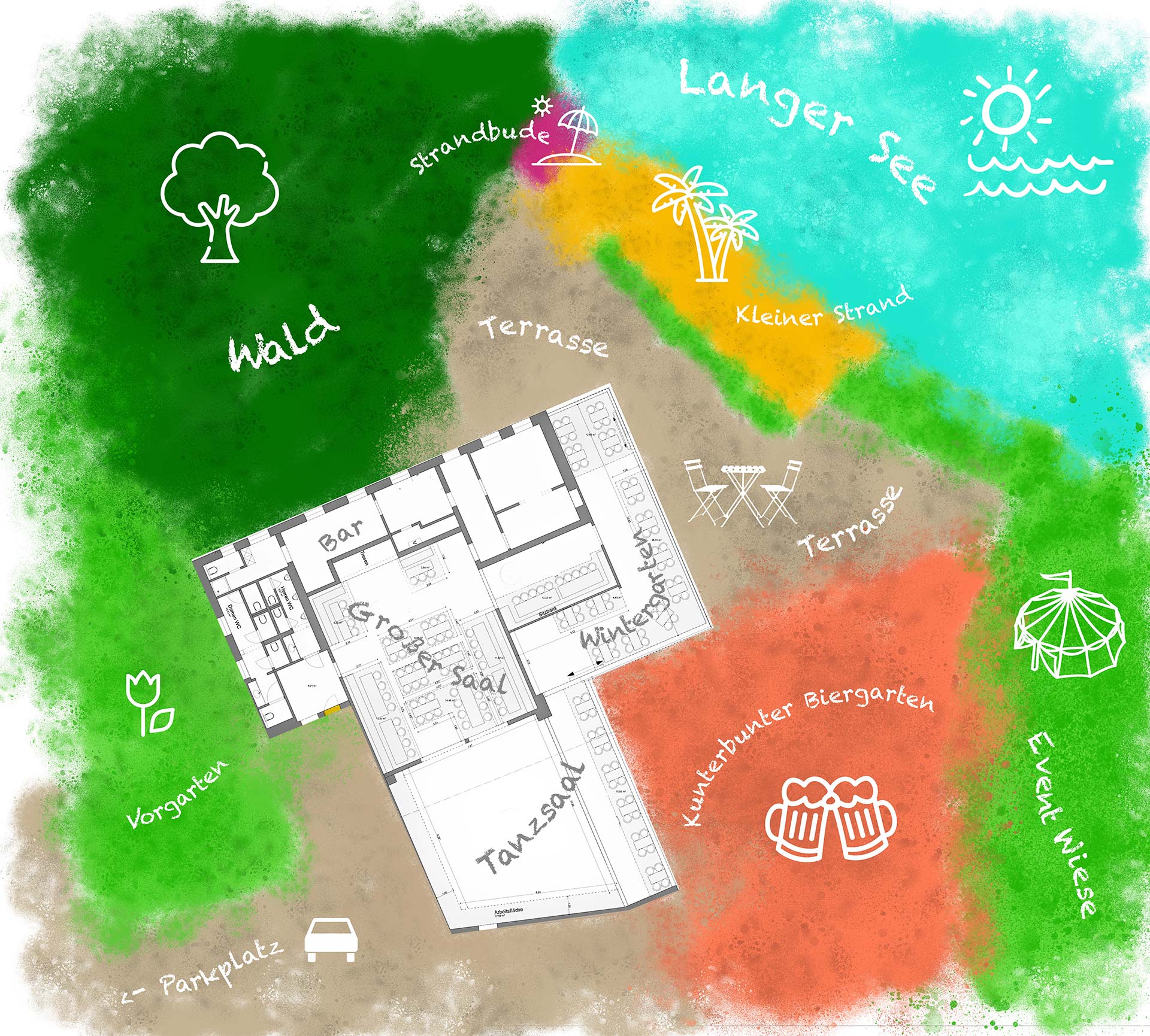 Die Aufteilung der Innenräume sowie die Verteilung der Outdoor Flächen eignet sich sowohl für große Gesellschaften als auch für Feiern in kleinerem Rahmen.